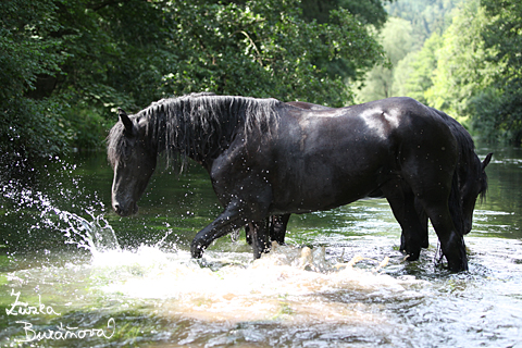 , 2009, fríský kůň, jeden, jiný, klisna, koupání, léto, na šířku, příroda, slunečno, v zelené řece, voda, vraník, |